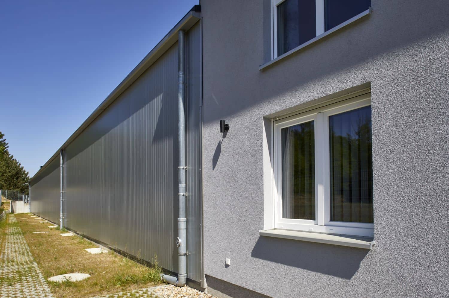 Die ISO-Paneele wurden mit der Oberflächen-Profilierung „leicht liniert“ und in der Farbe RAL 9006 (weißaluminium) vom Bauherrn ausgewählt. Die Sektionaltore der Lagerhalle mit Fertigbau setzen sich stimmig in RAL 7016 (anthrazitgrau) davon ab, schaffen so eine interessante Gebäudeoptik.