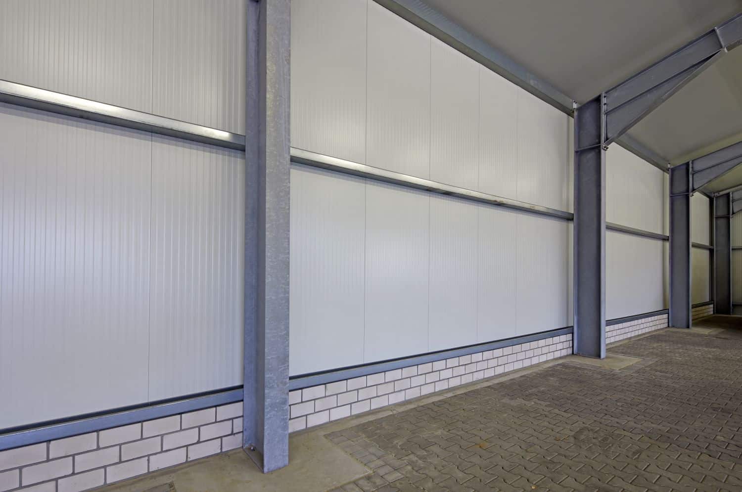 Der Wandabschluss wurde in diesem Fall durch einen bauseitig gemauerten Sockel realisiert. Die Gründung der Halle erfolgte über Punkt- und Streifenfundamente. Das Halleninnere wurde auf Fundamenthöhe gepflastert.