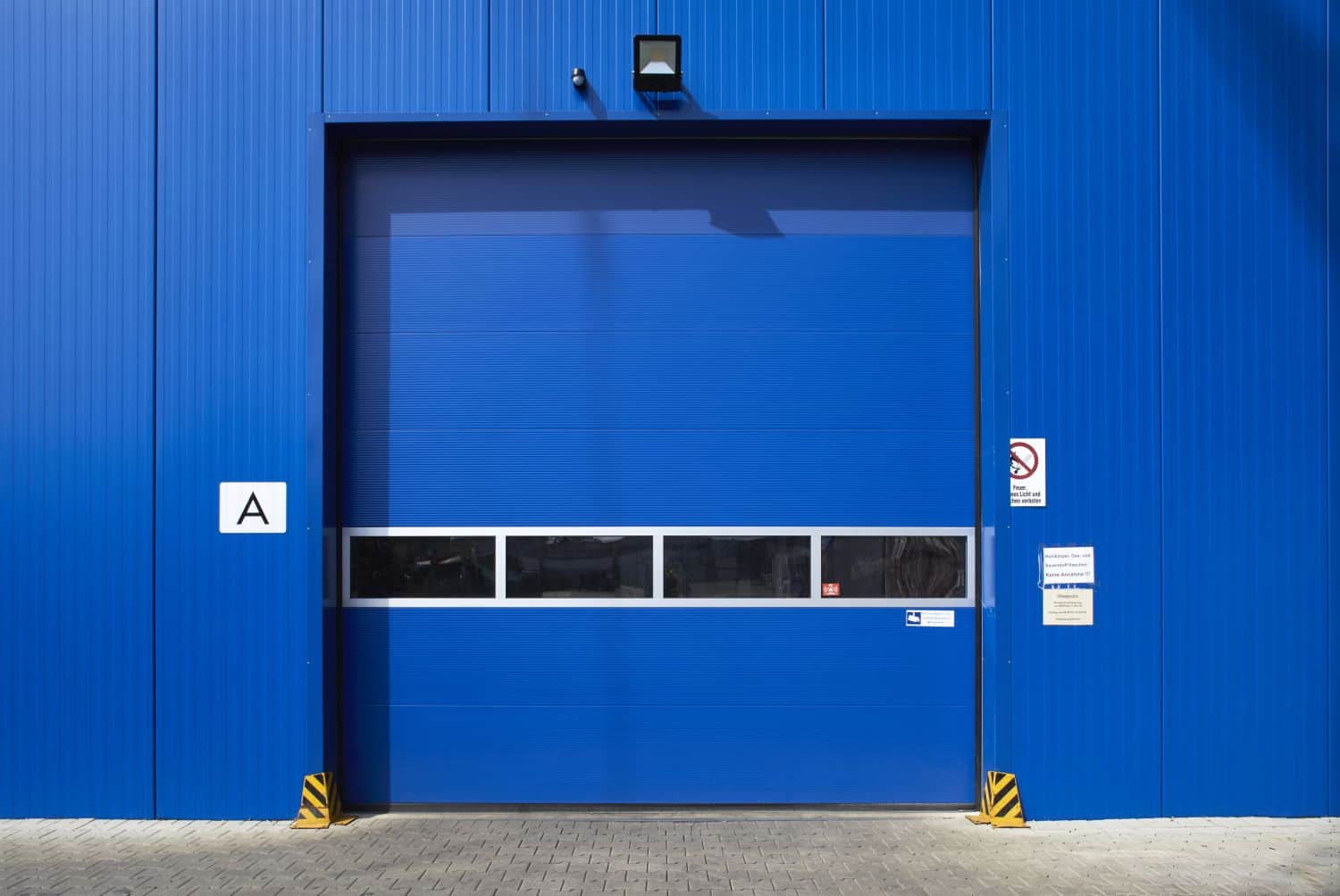 Für einen einheitliches Aussehen sorgen die farblich passend zur Außenwand verbauten Sektionaltore in RAL 5010 (enzianblau). Den Wunsch des Kunden von einer lichtdurchfluteten Halle wurde mittels eines großen Lichtfirsts sowie durch mehrere eingebauten PACO Kunststofffenster erfüllt. Die beiden PACO Mehrzwecktüren verschaffen mehrere Zugänge zum Halleninneren.